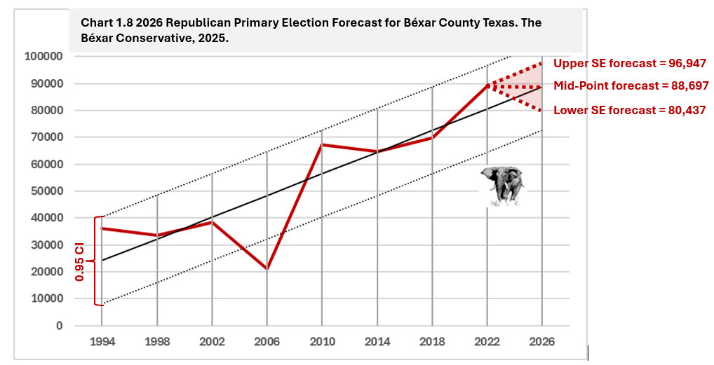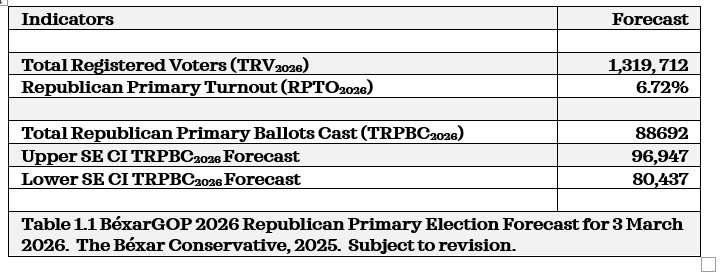 At the time of the Republican Primary Election, 3 March 2026, there will be an estimated 1,319,712 registered voters in Béxar County. The Béxar Conservative is forecasting a 6.72% Republican turnout in the Marh Primary.