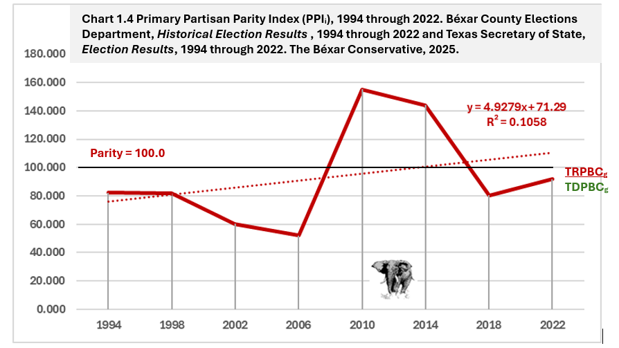 Chart 1.4 shows the Primary Partisan Parity Index (PPIg). The index measures the voting strength of Republicans to Socialists. If the index is > 100.00, Total Republican Primary Ballots Cast (TRPBCg) are greater than TDPBCg. If the index is < 100.00, Total Republican Primary Ballots Cast (TRPBCg) are less than TDPBCg . Republican Primary Voters only outperformed socialists in two primaries, 2010 and 2014, the Tea Party insurgency and the Open Gubernatorial Primary.