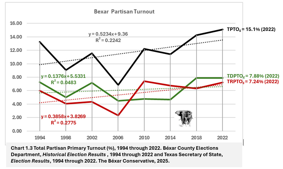 Chart 1.3 shows Total Partisan Turnout. The crimson line equals the Total Republican Primary Turnout (TRPTOg) and the green line equals the Total Democrat Primary Turnout TDPTOg. The data pattern and trend for these two indicators are very similar to partisan primary ballots cast. The historical average TRPTOg = 5.56%. These data show a clear convergence. In 2022, Béxar County experienced a record Primary Turnout of 15.1%.
