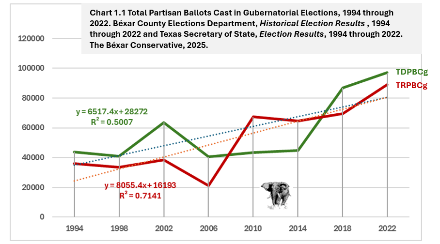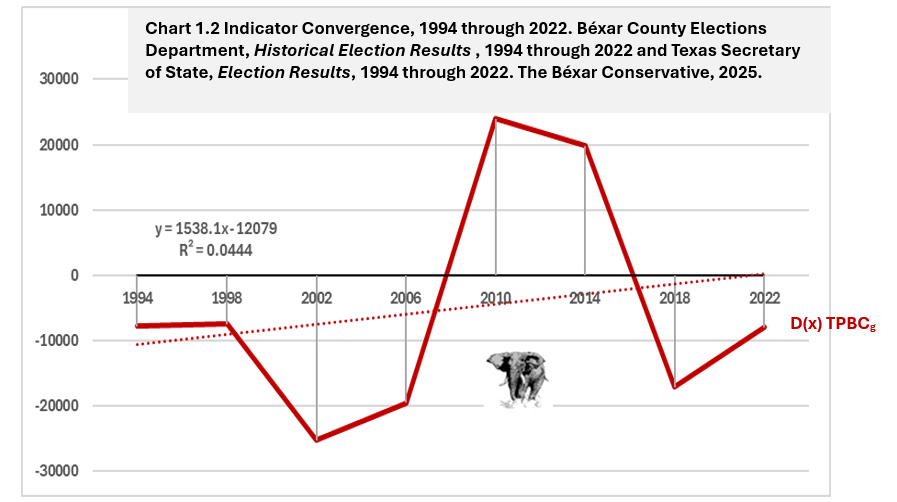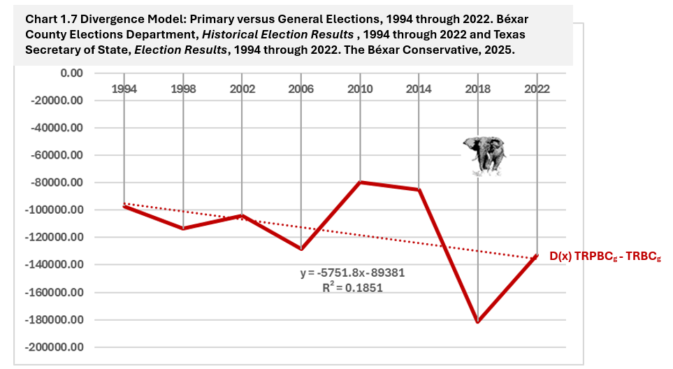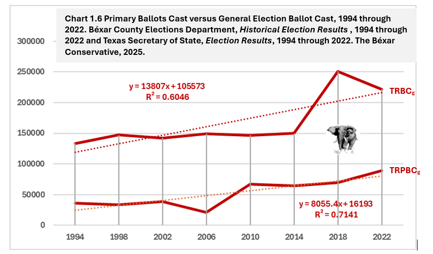 Chart 1.1 shows Total Republican Primary Ballots Cast (TRPBVg) and Total Democrat Primary Ballots Cast (TDPBCg) over the period from 1994 through 2022. Of the 8 primary elections, socialists outperformed republicans in 6 of the 8 (75%). From 1994 through 2006, Republicans consistently underperformed in Béxar County. The Tea Party insurgency manifest itself in 2010 and 2014, outperformed the socialists, but then in 2018 and 2022 Republican performance lagged the socialists. Over this entire period, Texas has had a Republican sitting as Chief Executive Officer - Governor. So, we might be suffering from the “Incumbent effect” as well, that is , fewer people turnout because we have control of state government.