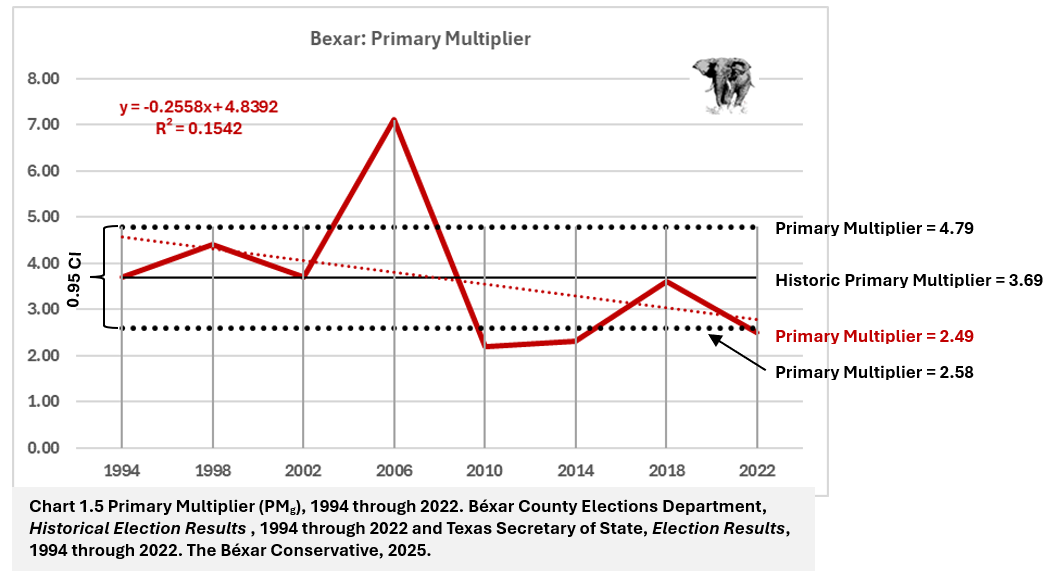 Chart 1.5 shows the Gubernatorial Primary Multiplier (PMg). PMg is a ratio of the Total Number of Republican Ballots Cast (TRBCg) in the General (Gubernatorial) Election to the Total Number of Republican Primary Ballots Cast (TRPBCg). PMg peaked in 2006 (≈7.0), while reaching a trough in 2010 (≈2.2). PMg measures how primary participation translates into general election strength (often for a party). The declining trend suggests reduced conversion efficiency — i.e., the gap between primary and general performance has widened or voter alignment between the two stages has weakened.