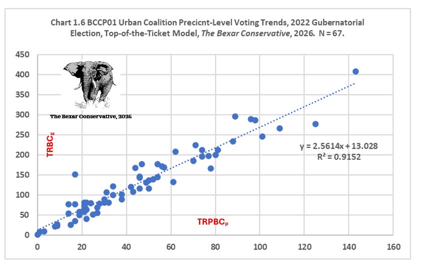 Urban Coalition precincts: The UrbanGOP sample consists of 67 precincts, all situated within Loop 410. The Republican vote (TRBCg) demonstrates consistency and exhibits limited variation. The regression analysis is presented as an evaluation between TRBCg as a function of TRPBCp , e.g.,