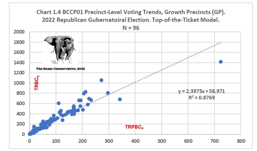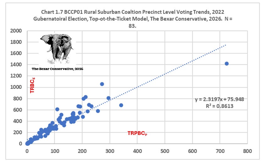 Rural–Suburban Coalition precincts (RSCGOP): sub sample size equals 83, all these precincts lie outside Loop 410. This sample could be further divided into Rural and Suburban; however, at this time we will keep the sample as defined at this time. The precincts making up the Rural Suburban Coalition sample display greater heterogeneity (a big word for assortment). Regression analysis confirms a strong relationship (R² ≈ 0.86), e.g.