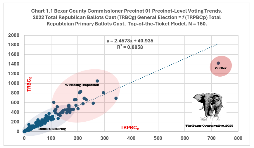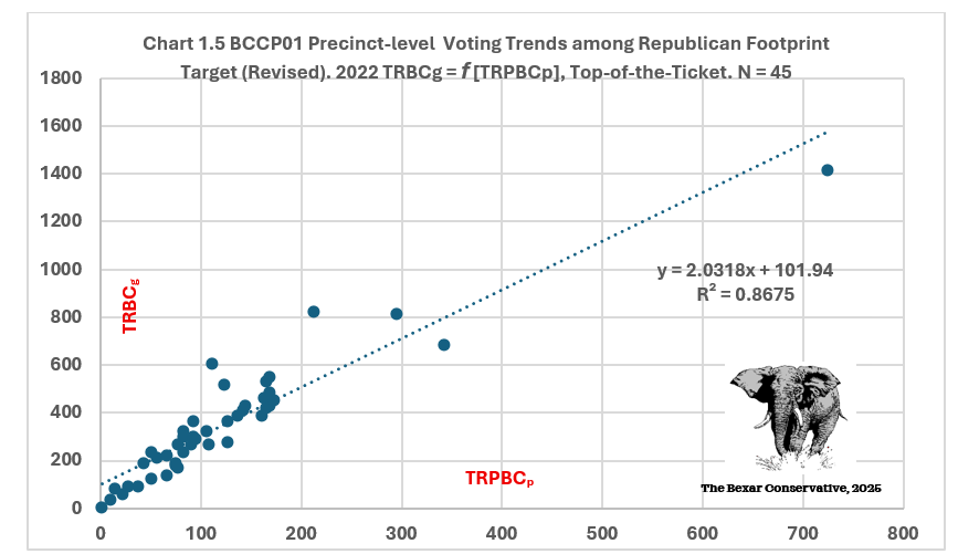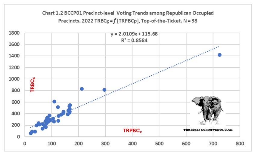 Republican primary turnout is an excellent proxy for precinct-level Republican general-election performance. Deviations from the line are analytically interesting. Precincts tracking above trend are where Republicans expanded well beyond their primary base (higher conversion). Precincts below trend demonstrate Republican failure to convert primary enthusiasm into general-election turnout. This chart provides strong empirical support that Republican general-election performance scales predictably with primary engagement, making TRPBCp a strong baseline variable for turnout modeling, anomaly detection, or (as TBC’s earlier work suggests) friction or conversion indices.